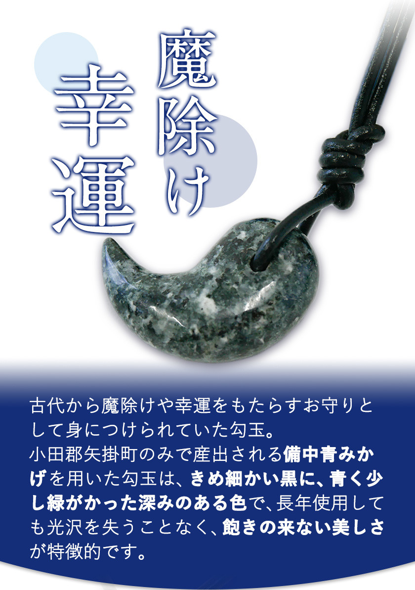 地場産品基準 告示第5条第2号に適合 適合理由:ネックレスの飾りの勾玉が100%矢掛町で採取される備中青みかげ石を使用しており、製品全体の付加価値の90%以上を占めている。