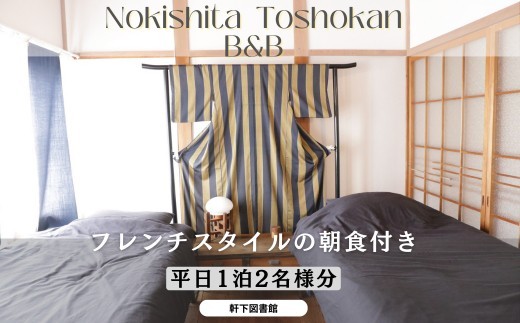 ◆宿泊券の利用方法 ・宿泊券ご利用には事前にご予約が必要となります。 宿泊券が届きましたら、軒下図書館B&Bへメール(nokishita.toshokan@gmail.com)にてご予約をお願いいたします。 詳細はWEBにて「軒下図書館」と検索し、ホームページをご確認ください。 ・宿泊予定日が満室の場合は、日程の変更もしくはお断りする場合があります。 ・ご予約時に、ふるさと納税ご宿泊券ご利用の旨をお伝えください。ご宿泊当日は、必ず宿泊券をご持参し、チェックイン時にお渡しください。 ◆注意事項 ・朝食のみ含まれておりますので、夕食が必要な方は、その旨をおしらせください。 ・ご宿泊前に、事前に当店のホームページをご覧いただき、詳細をご確認ください。 ・紛失等による再発行は出来かねますので、ご了承くださいませ。 ◆有効期限 発行日より1年間