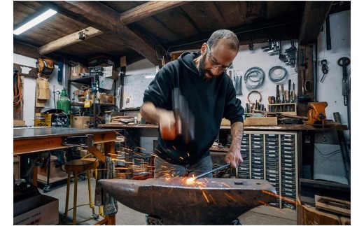 <杉エンドグレイン天板×鉄脚Novo> 西粟倉近隣産の杉無垢材を使用し、年輪の模様が美しい天板。 アイアン脚はポルトガル語で「新しい」という意味の「Novo」 まるで踊っているような躍動的な鉄脚が、明るく楽しい空間を生み出します。 年輪の模様が美しい、エンドグレイン(小口)を切り組み合わせ接着する作業を繰り返し滑らかに磨きあげた天板と、細部まで手作業で、その質感や色合いを残し仕上げた鉄脚。 テーブルはもちろん、キッチンや洗面台のちょっとした椅子としても便利。 グリーンをあしらったり、ソファ横のサイドテーブルにしたりと使い方は自由自在。 【Feuerwork-フォイヤワーク】 家具にとどまらず、アイアン製の店舗看板や公共施設の什器など、さまざまな分野のオーダーを手掛けてきたFeuerwork-フォイヤワーク。 イスラエル出身の職人リファが、オリジナル家具をはじめ、多様なカスタムオーダーから既存にはないアイデアの具現化まで幅広く対応し、自然美をモチーフにした遊び心のあるプロダクトを制作。 現在は、岡山県西粟倉村の築120年以上の古民家に工房と住居を構え、日本の自然にインスピレーションを得ながら、日々鉄と木が持つ可能性を追求している。 地場産品に該当する理由 区域内の工房で原料の仕入れ、加工、組立、梱包まで全ての工程を行っている。