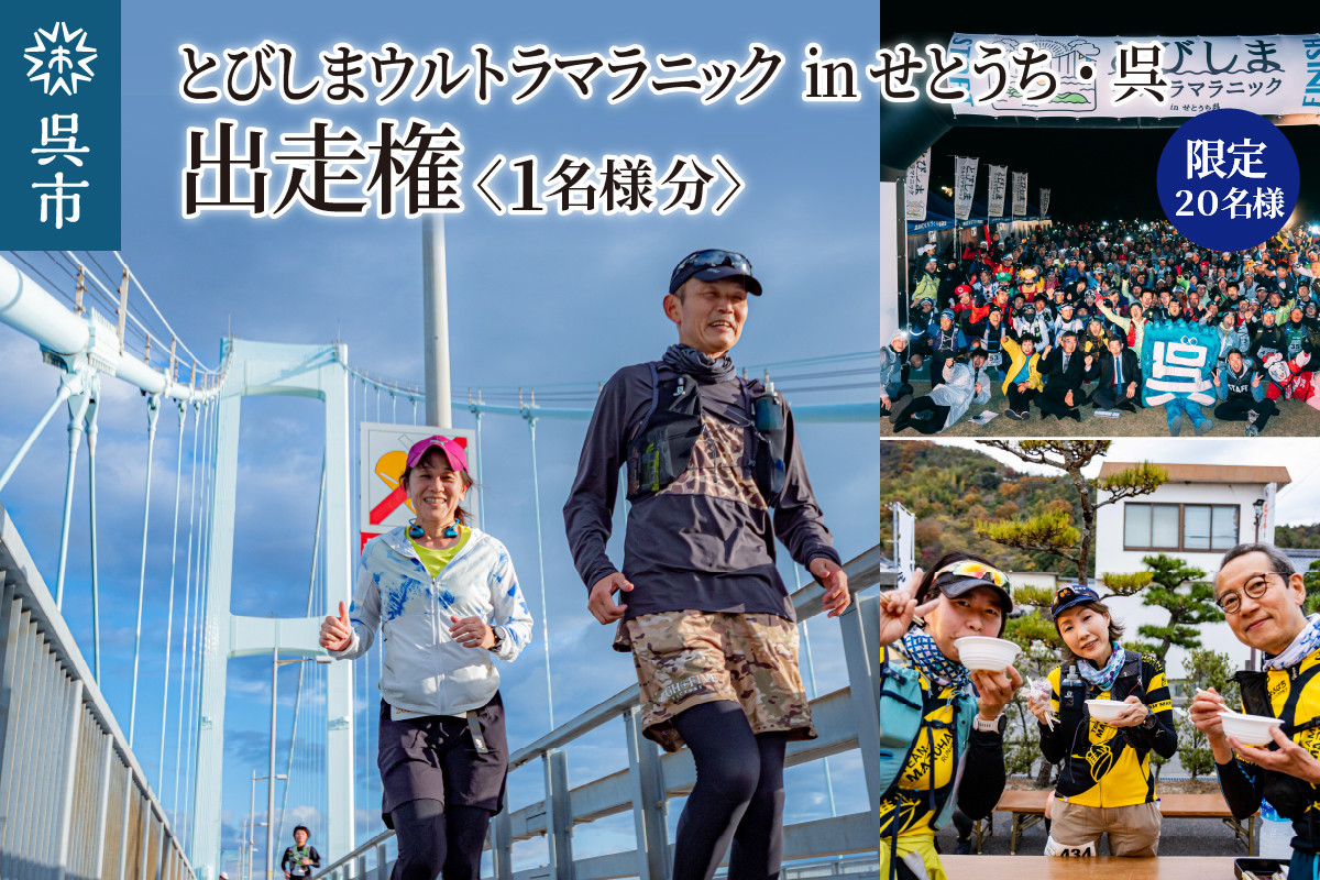 | 容量 | とびしまウルトラマラニック in せとうち・呉 出走権 ※ふるさとチョイスでの申し込み後、大会エントリーサイト(とびしまウルトラマラニック)への申し込みが必要です。 |