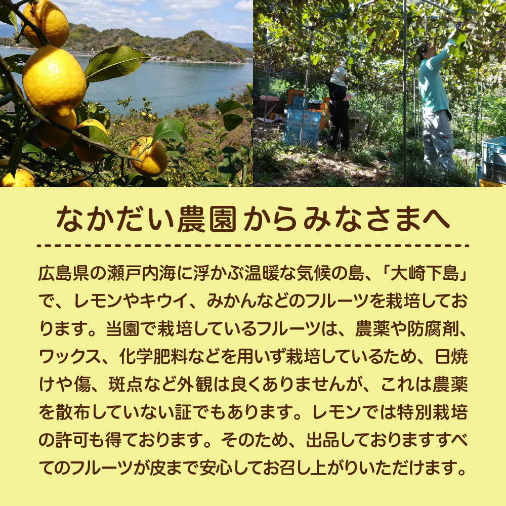 広島県の瀬戸内海に浮かぶ島の温暖な気候で育てた【防腐剤、化学肥料、栽培期間中の農薬、ワックスなど不使用】の特別栽培レモンです。