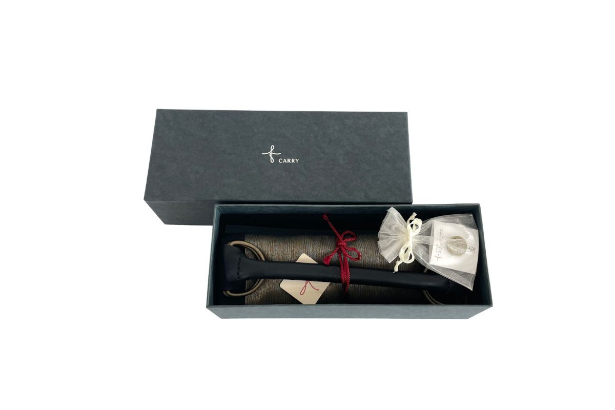 | 容量 | ふろしきハンド:手縫い牛革製(約1.4cmφ×28cm Dカン内径40mm×29mm) ふろしき(黒/ゴールド):綿50%、ポリエステル50% パール箔織込(約82cm角) スナップピアス:真鍮、鉄、マグネット(約1.8cmφ×2cm) 化粧箱入り |