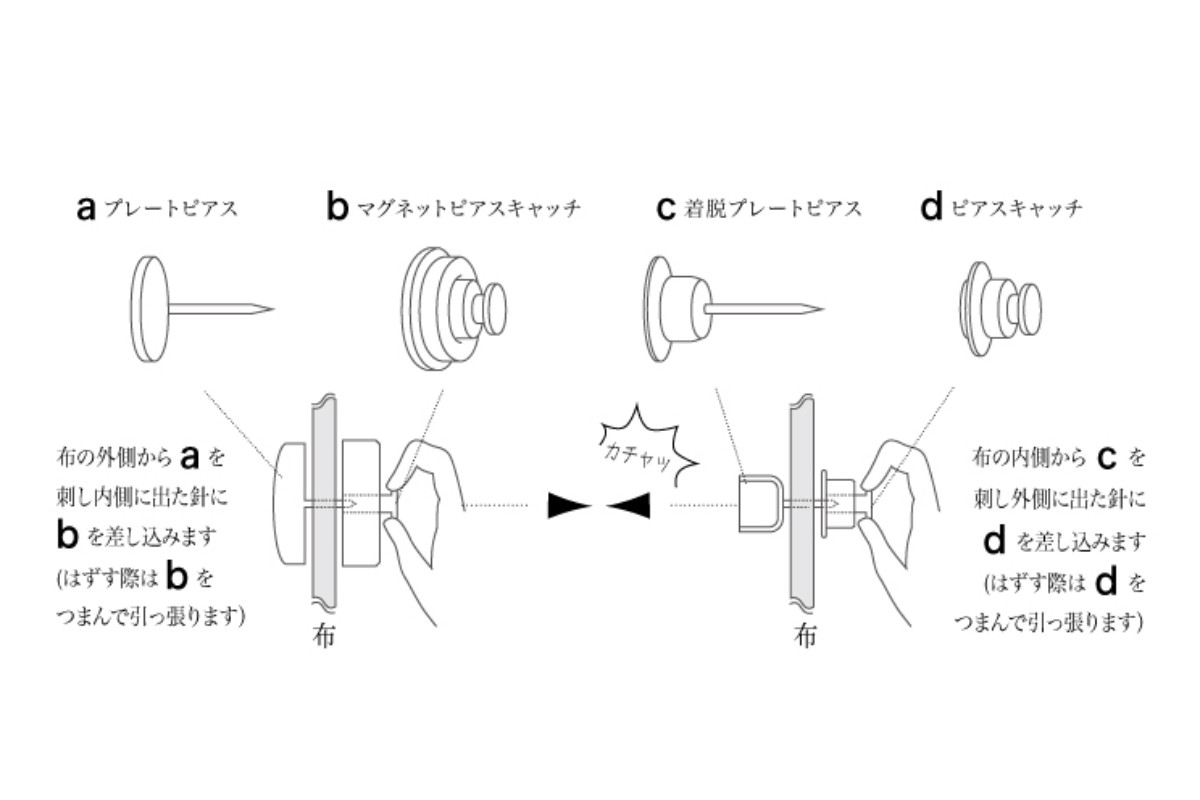 「スナップピアス」はオリジナルの商品で、ふろしきバッグの口に付ければマグネットボタンとして開閉できるため、ふろしきバッグがより使いやすくなります。