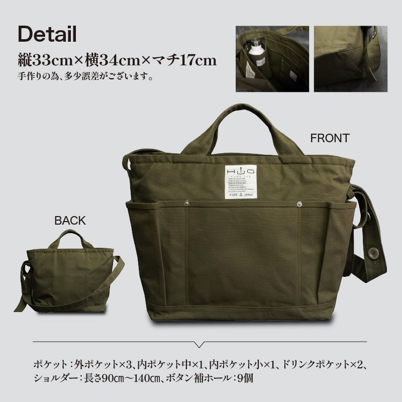| 容量 | サイズ:(約)縦33cm×横34cm×マチ17cm ※手作りの為、多少誤差がございます。 ●ショルダー長さ調節可(ボタンホール9コ) 長さ: 最短90cm~最長140cm ●カラー:カーキ・グレー・ブラック ●ボタン:メタル ●Made in JAPAN(日本製) |
