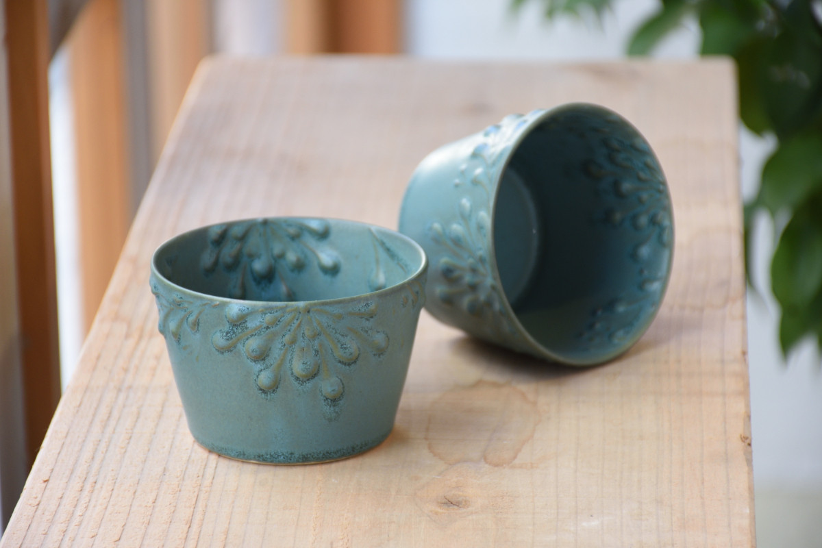控えめでも存在感。女性陶芸家が作る一点もの いっちん文様 陶器製 そば猪口 渋い錆浅葱色 2個セット 食器 陶器 器 小鉢 おちょこ 手づくり 焼き物 おしゃれ 広島県 呉市