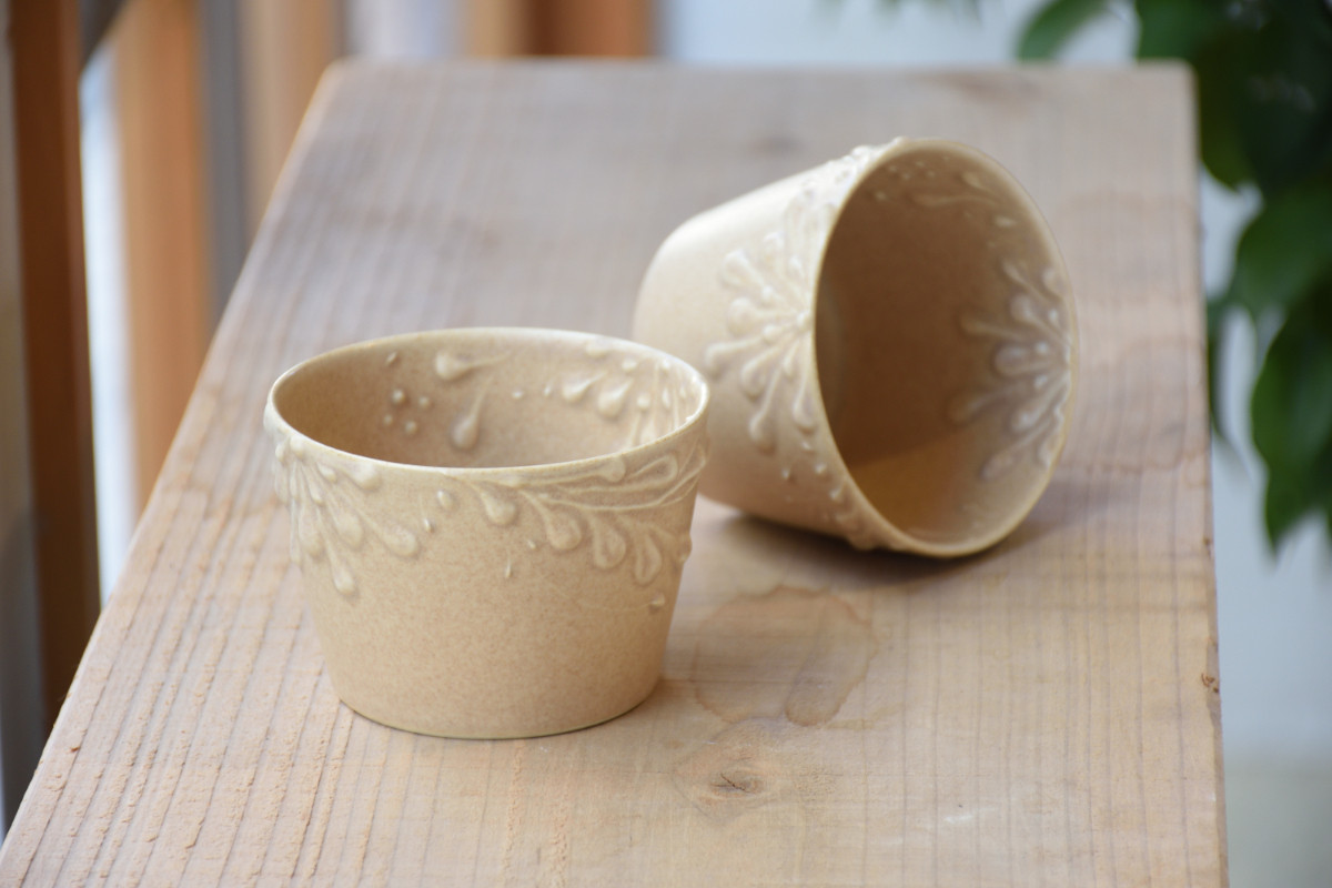 控えめでも存在感。女性陶芸家が作る一点もの いっちん文様 陶器製 そば猪口 柔らか亜麻色 2個セット 食器 陶器 器 小鉢 おちょこ 手づくり 焼き物 おしゃれ 広島県 呉市