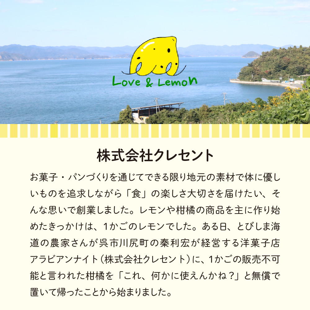 国産小麦と国産原材料を使用し、ケーキ生地を作り、レモン産地の故郷、広島県とびしま海道大長でとれたレモンの果皮をふんだんに練り混んで生地を焼き上げ、オリジナルレモンリキュールをたっぷり染み込ませた大人なレモンケーキです。