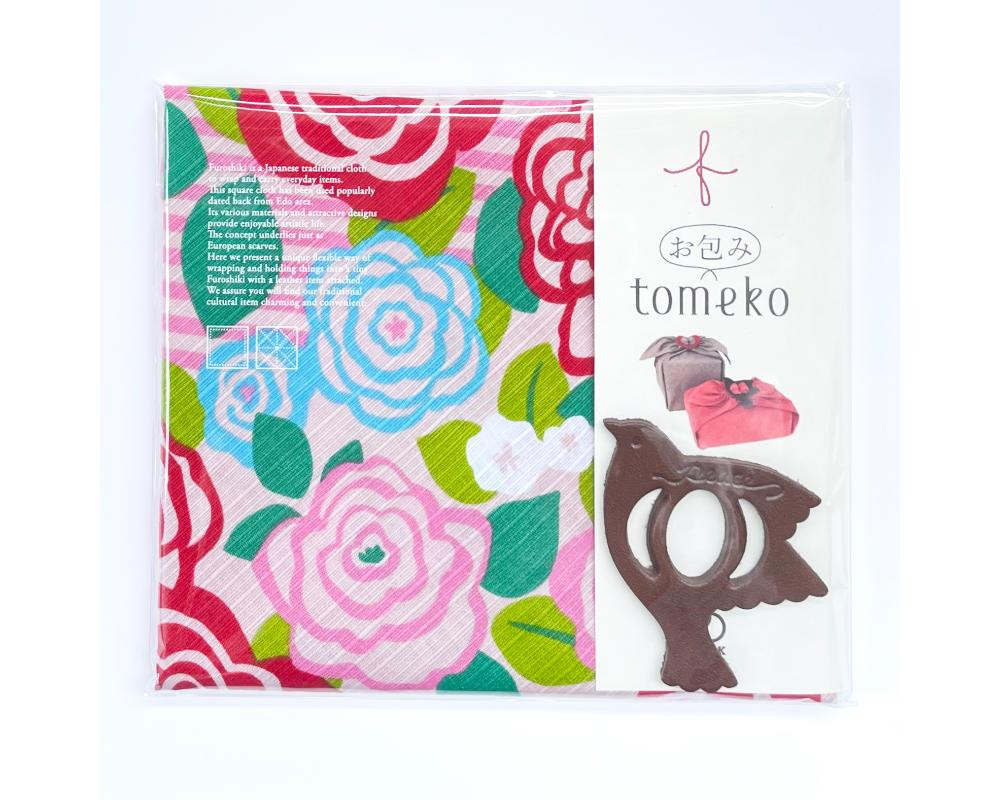 お弁当箱などを小ふろしきで包むとき、結ぶかわりに留めてアクセントにもなる「 お包みtomeko」と小ふろしき(チーフ)の各1個セットです。
