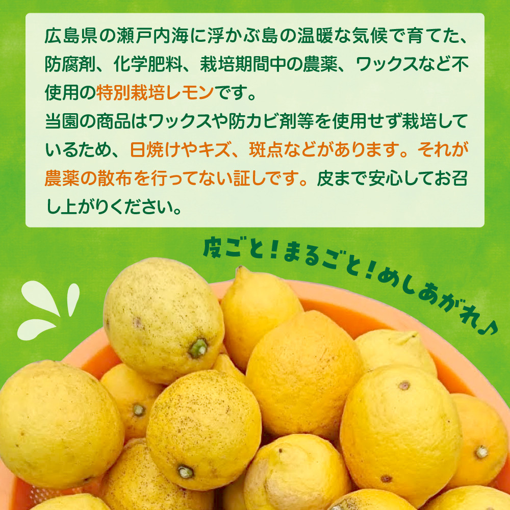 広島県の瀬戸内海に浮かぶ島の温暖な気候で育てた【防腐剤、化学肥料、栽培期間中の農薬、ワックスなど不使用】の特別栽培レモンです。