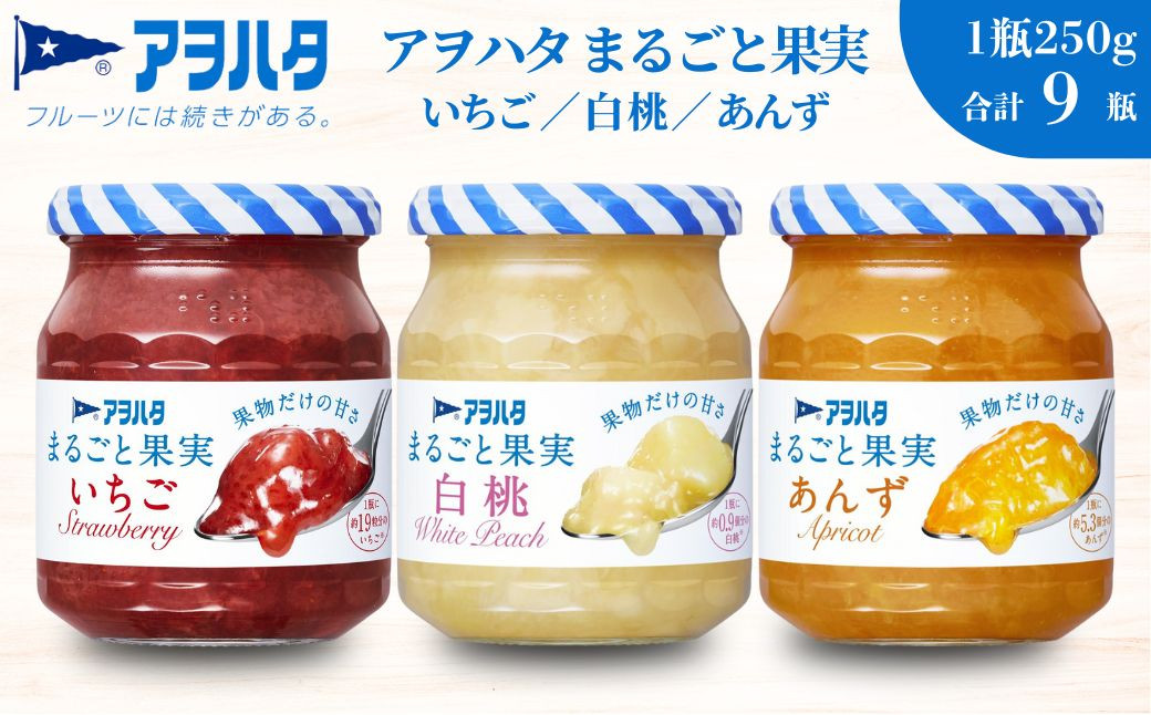 【アヲハタジャム】まるごと果実 いちご / 白桃 / あんず 各3瓶 合計9瓶(1瓶250g〜255g) ジャム ママレード マーマレード 果物 フルーツ もも 桃 杏 白桃ジャム いちごジャム あんずジャム 苺 イチゴ