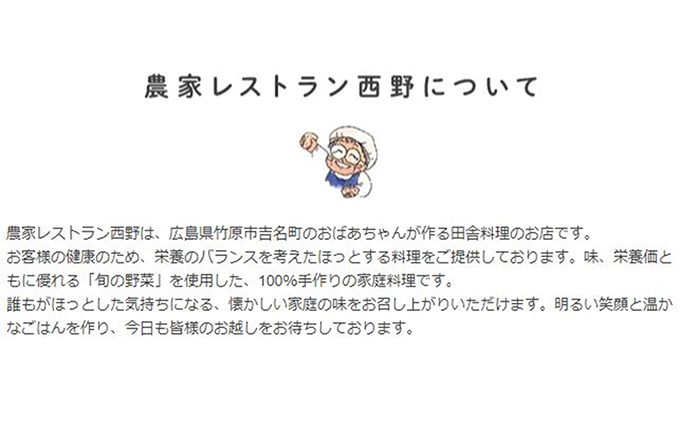 【作り手は,元気いっぱい!のおばあちゃんたち】「農家レストラン西野」の主要メンバーは 元気いっぱい!のおばあちゃんたちです!「農家レストラン西野」さんの惣菜やお菓子がどこか懐かしくやさしく、 食べたら元気になれるのは 元気で笑顔いっぱいの おばあちゃんたちが 作られているからこそです。「農家レストラン西野」さんは 味と品質にもこだわり、米・野菜・味噌はすべて自家製野菜を使用・海の幸は目の前の瀬戸内海で獲れる天然物を使用・味,栄養価ともに優れた「旬の食材」を100%手作りでご提供 のコンセプトで 積極的に地産地消に取り組んでいます。タケノコが特産品の竹原では,現在,タケノコ生産者の高齢化が進み後継者が不足しています。タケノコを活用して生産者さんや竹原を応援したいというお気持ちから生まれた 【タケノコの郷】 ぜひ一度おためしください 。
