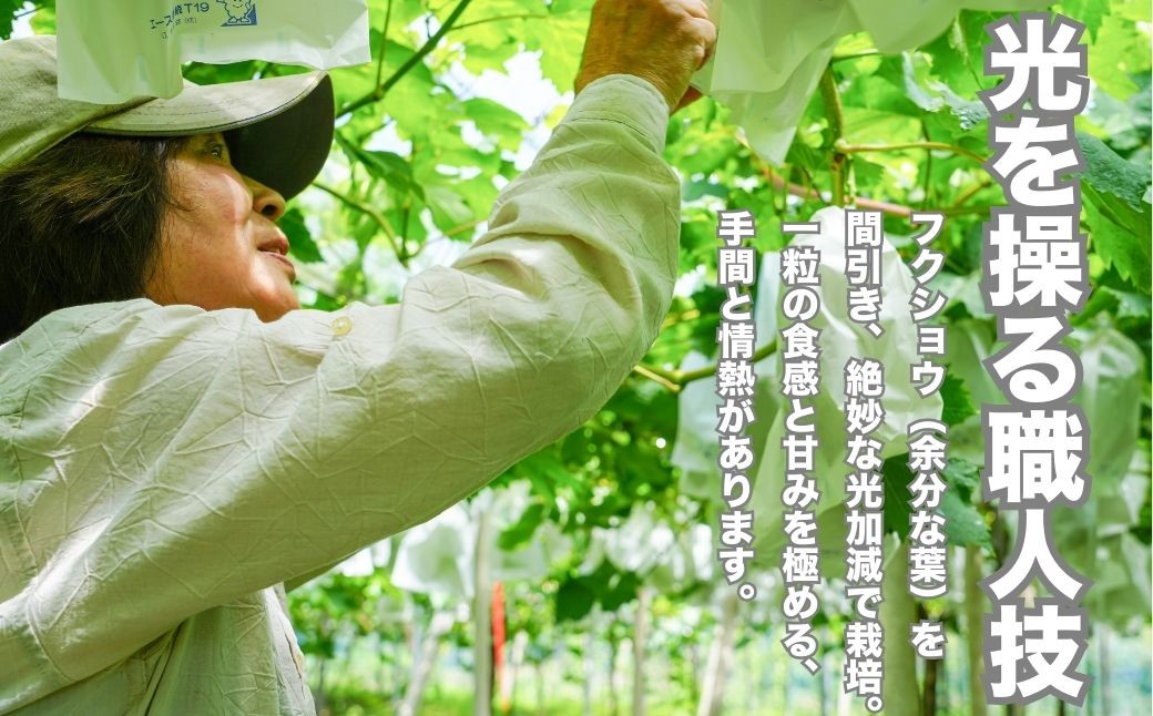 収穫は8月末から9月にかけて。完熟の瞬間を見極め、一房ずつ丁寧に収穫し、その日の鮮度をそのままお届けします。
