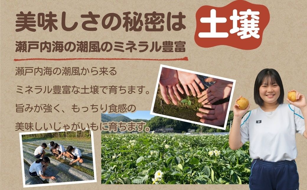 瀬戸内海のミネラルたっぷりな土は水はけが良く、養分をしっかりと蓄えるため、果肉が緻密で甘みのあるじゃがいもに育ちます。