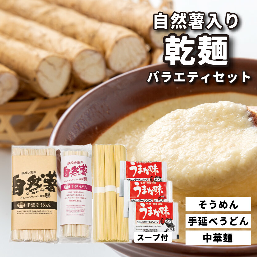 | 容量 | 自然薯入り素麺 250g×1袋、自然薯入り手延べうどん 200g×1袋、ラーメン240g×1袋、とんこつラーメンスープ×3袋 ※当該返礼品は、市内で製造しており、全体の付加価値の半分を一定以上上回る割合を占めています。 |