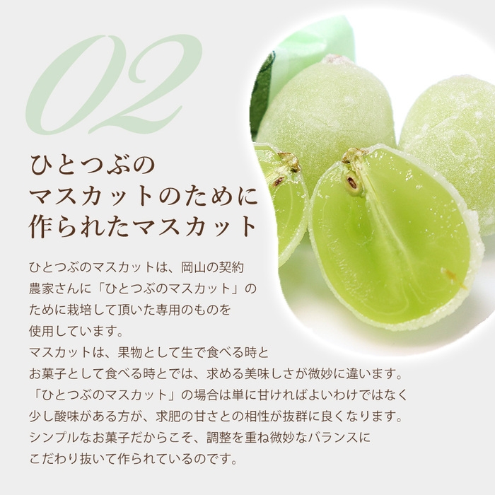 ※マスカットの食感を活かすため、求肥をあえて極力薄く巻き、さらに乾燥させる工程を経ております。