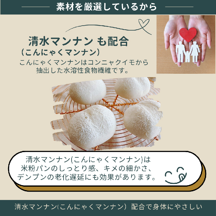 米粉にはでんぷんの質にこだわり、米浸漬気流粉砕(酵素処理)を行った上で、焼き上がりの質感とおいしさ保持のために「こんにゃくマンナン」を配合しました。