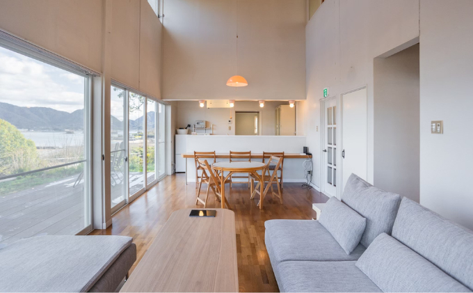 広々としたリビングから見える瀬戸内の絶景、海へのびるデッキ、景色を見ながら整う檜の日本製バレルサウナ。お部屋はリビングと和室(寝室1F・2F)2室で、リビングのソファベッド利用で最大6名まで宿泊可能。