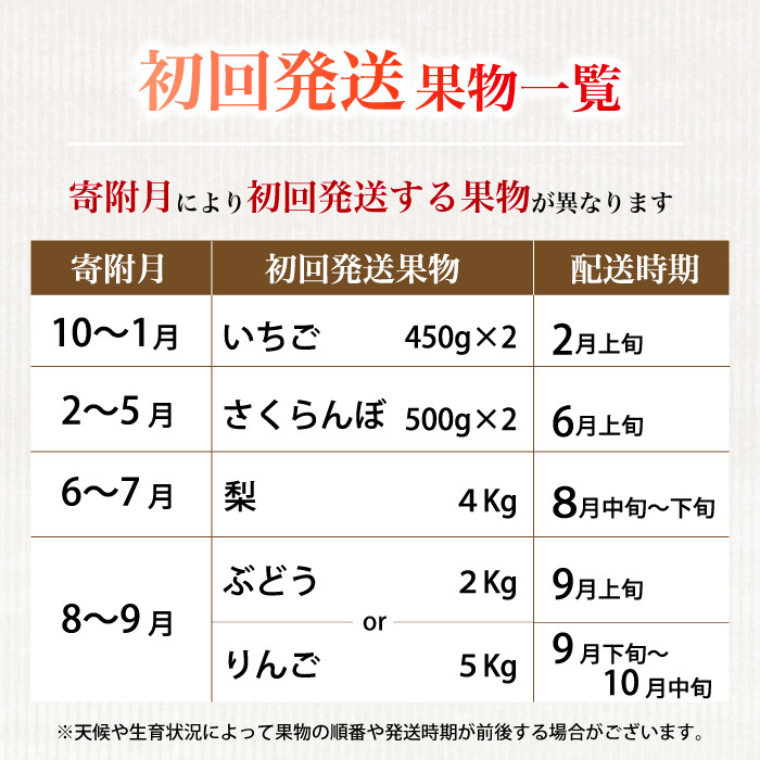 | 容量 | 【フルーツ定期便】全5回 2月上旬頃発送:いちご 900g(450g×2) 6月上旬頃発送:さくらんぼ 1kg(500g×2) 8月中旬~下旬頃発送:梨 4kg 9月上旬頃発送:ぶどう 2kg 9月下旬~10月中旬頃発送:りんご 5kg |