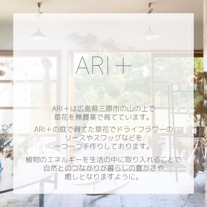 ARI+の庭で育てた草花や自然の恵みをいただいて、ドライフラワーのリースやスワッグなどを一つ一つ手作りしております。