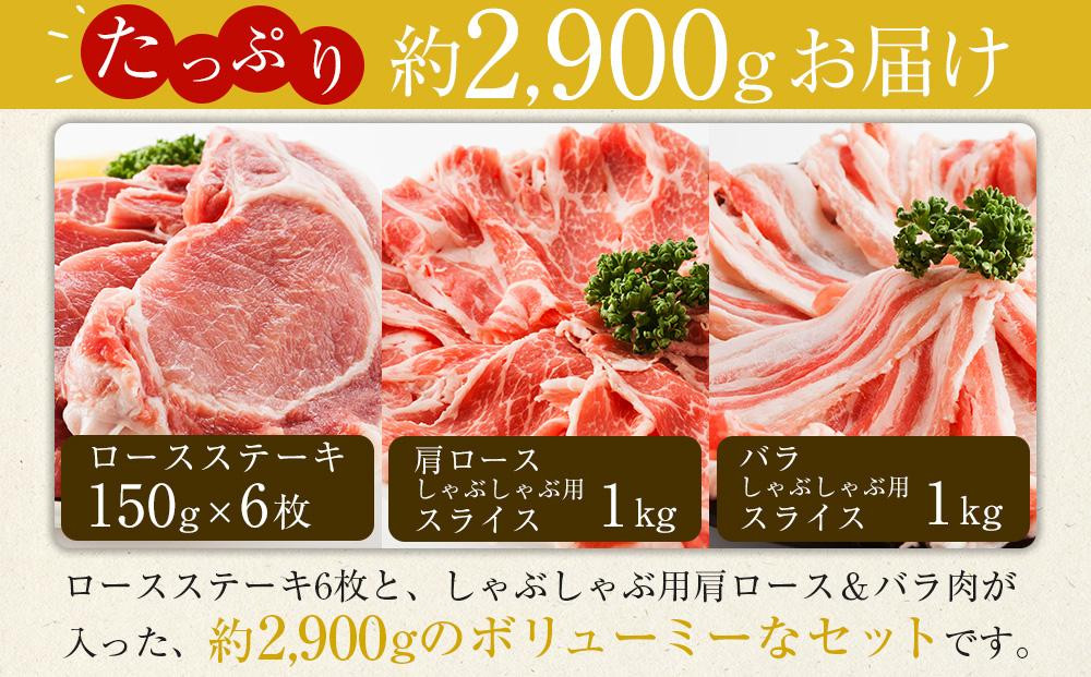 【たっぷりセット】ロースステーキ6枚と、しゃぶしゃぶ用肩ロース&バラ肉が入った、約2,900gのボリューミーなセットです。