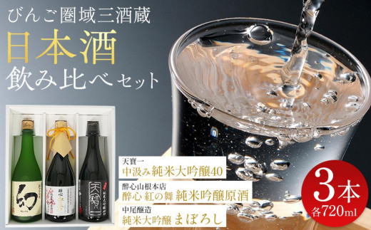 備後圏域の酒蔵を集めた日本酒セット。 福山市・三原市・竹原市のお酒が味わえます。 <天寶一>中汲み純米大吟醸40 一番美味しい中汲み部分を瓶詰した純米大吟醸。特別栽培米「山田錦」を使用したことで、山田錦由来のコクを上品に表現しています。 <醉心山根本店>醉心 紅の舞 純米吟醸原酒 広島県産の酒造好適米を100%使用し、さらに仕込み水には広島県中央部のブナの原生林より湧き出る天然水を100%使って造ったお酒。正に“広島のお酒”。華やかな果実香と奥深い味わいがマッチした、純米吟醸原酒です。 <中尾醸造>純米大吟醸 まぼろし 4代目中尾清磨が発見したリンゴ酵母で醸した純米大吟醸酒。1948年に全国品評会で1位を受賞、3年連続で皇室新年御用酒の栄を賜りました。当時の製法を忠実に守り、今に再現したお酒です。 この返礼品は、福山市・三原市・竹原市の各市で製造された、備後圏域共通返礼品です。 【備後圏域連携中枢都市圏】 備後圏域は、広島県の三原市・尾道市・福山市・府中市・竹原市・世羅町・神石高原町、岡山県の笠岡市・井原市の7市2町で構成されています。 県境を越えて生活圏が重なり、地域の結びつきが強いのは、古くは備後国として1つであった歴史があったから。 中国地方の交通・物流の拠点であり、ものづくり産業の中心地、美しい景色に恵まれた観光地、そして温かな人々が住む圏域です。