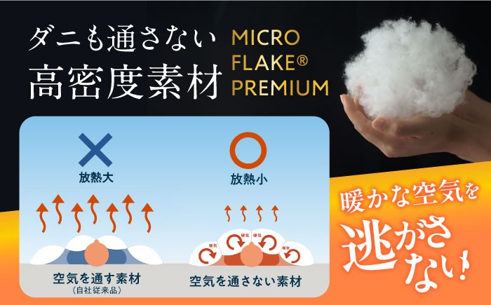 天然羽毛のデメリットであるニオイ・埃・アレルギー・洗濯の課題を解決する新開発の中綿、「MICRO FLAKE(R)PREMIUM」を使用した圧倒的保温力のある掛布団「ウルトラ暖睡コンフォーター プレミアム30」。