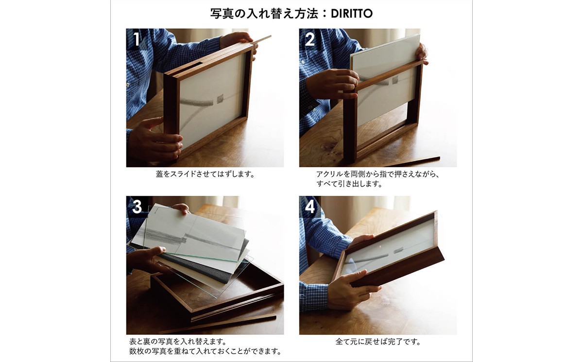写真の入れ替え方法は、蓋をスライドさせてはずし、アクリルを両面から指で押さえながら、すべて引き出します。