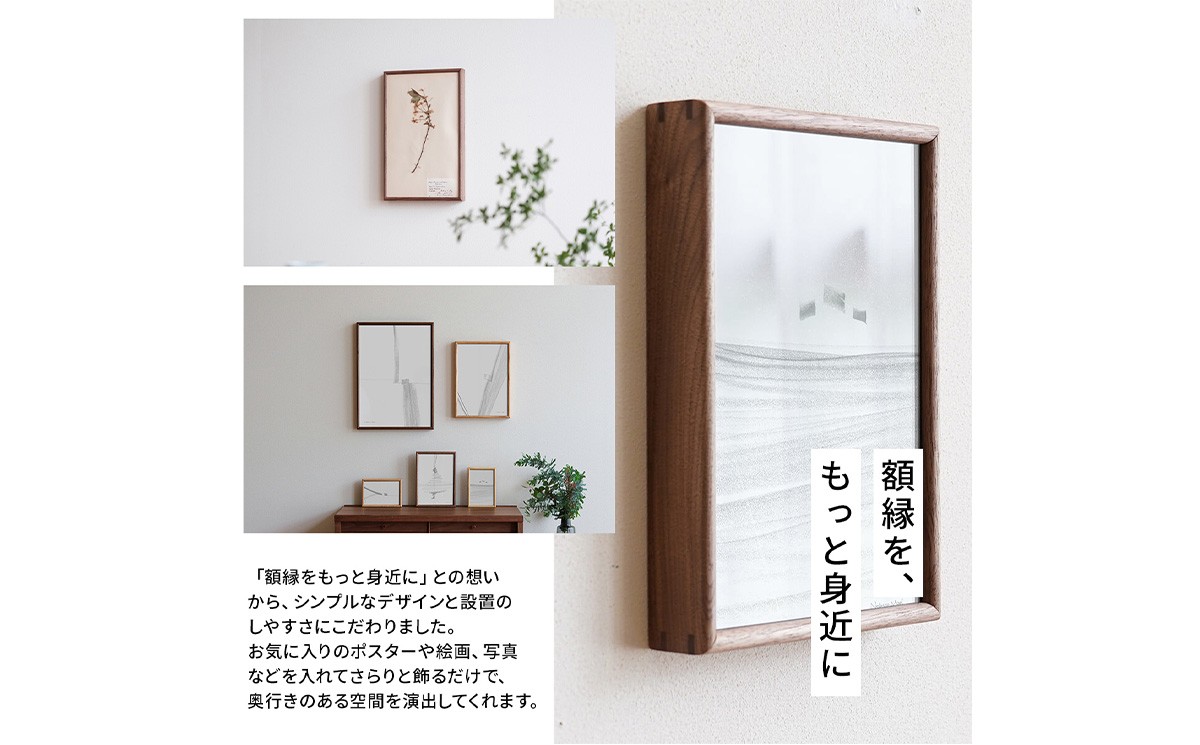 「額縁をもっと身近に」という想いから、シンプルで現代的なデザインと設置のしやすさにこだわりました。賃貸のお部屋にも手軽に取り入れていただけます。