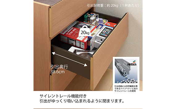 大型TV 向けに少し低めのTV ボードを中心として、幅や高さの違うチェストを組み合わせる事で、単調になりがちな壁面に躍動感が生まれます。AV 機器や小物類、貴重品に最適な収納機能も充実しています。世界的に有名なドイツヘティヒ社製レール採用。チェスト最下段の引出し内部には、貴重品の収納に便利な鍵付の内引出しがございます。底板表面は貴重品にやさしいベロア仕上げとなっています。