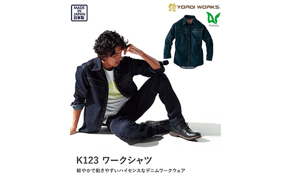 日本製生地と国内縫製にこだわったデニムワークウェア「YOROI WORKS」は、デニムの街である広島県備後地方に本社がある、ワークウェアの旭蝶とデニムメーカーのカイハラとのコラボ開発によって誕生しました。デニムといえば一般的に綿100%ですが、ポリウレタンを加えることでワークシーンでも動きやすいストレッチ性能をプラス。空気をたっぷり含んだ中空糸により、見た目のハードな印象に反して、軽く着心地のよい着用感が特徴です。「格好良さ」を追求したハイセンスなデザインに加え、ワークウェアとしての機能性を加えることで、気持ちがあがること間違いなし!
