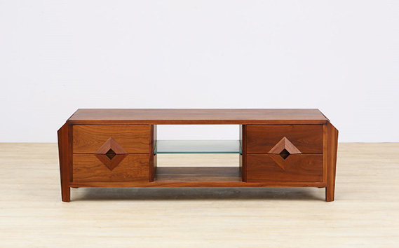 単なる無垢素材そのままの耳付きのデザインややさしさ、あたたかさを強調する極端に丸いデザインをあえて避けてスタイリッシュなフォルムで仕上げました。多面立方体の構成が基本のデザインはシャープな加工や鋭角だけでつなぎ合わせる技術が必要です。伝統技術の留め加工、蟻組加工などを手作業ではなく、土井木工の最先端のCNCルーターで加工することで実現します。