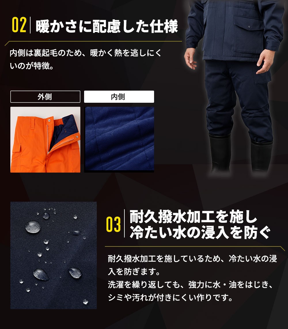 氷点下になる寒冷地での作業やマイナス20度からマイナス30度の冷凍庫で着用する防寒ズボン。