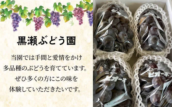 黒瀬ぶどう園では、ニューピオーネを中心に、シャインマスカットや安芸クイーン、デラウェアなど、多様なブドウ品種を栽培しています。
