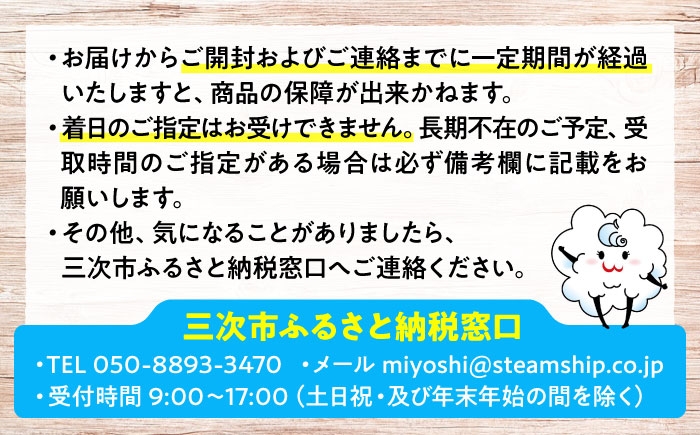| 容量 | 不揃い小房ニューピオーネ12から15房(合計約6kg) ■ご注文に関する注意事項 ※収穫時期が限られている為、配送日時のご指定はお受けできません。長期不在のご予定、受取時間のご指定がある場合は、必ず備考欄に記載をお願いします。(不在ご連絡がなく、お受け取りができなかった場合の再配送はできかねますので、予めご了承くださいませ。) ※発送時期は、例年の発送時期になっております。その年の天候や生育状況によりお届けが遅れる、又は早まることがあります。 ※種なしの品種の場合もまれに種が入る場合がございます。 ※天候状況や栽培状況により色にばらつきがあることがありますので、色や個人の食感、味覚について対応はできませんのでご了承ください。 ※丁寧な梱包を心がけておりますが、配送時の揺れや傾き、衝撃等により、ごくまれに房から実が外れてしまう場合がございます。予めご了承いただきお申込み願います。 ※返礼品の状態には万全を期していますが、万が一不良等があった場合は、返礼品到着の翌日まで(土日の場合は翌月曜日まで)に写真画像を添付の上、電子メールにて【三次市ふるさと納税窓口】へご連絡ください。 ※お届けからご開封およびご連絡までに一定期間が経過いたしますと、商品の保障が出来かねます。 【原料原産地】 広島県産 |