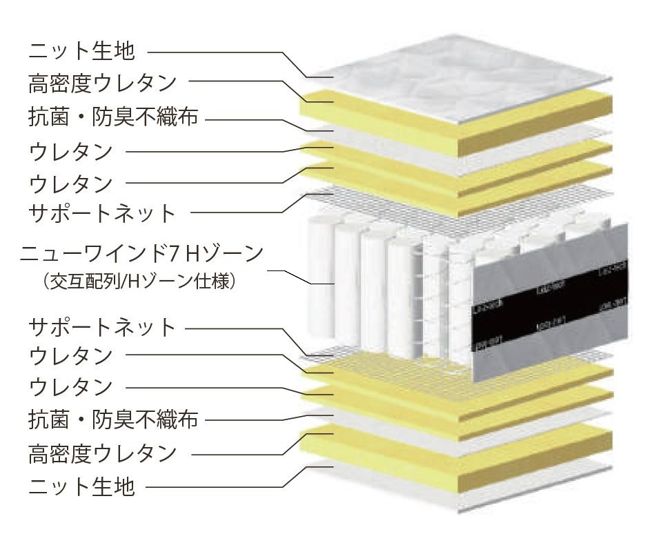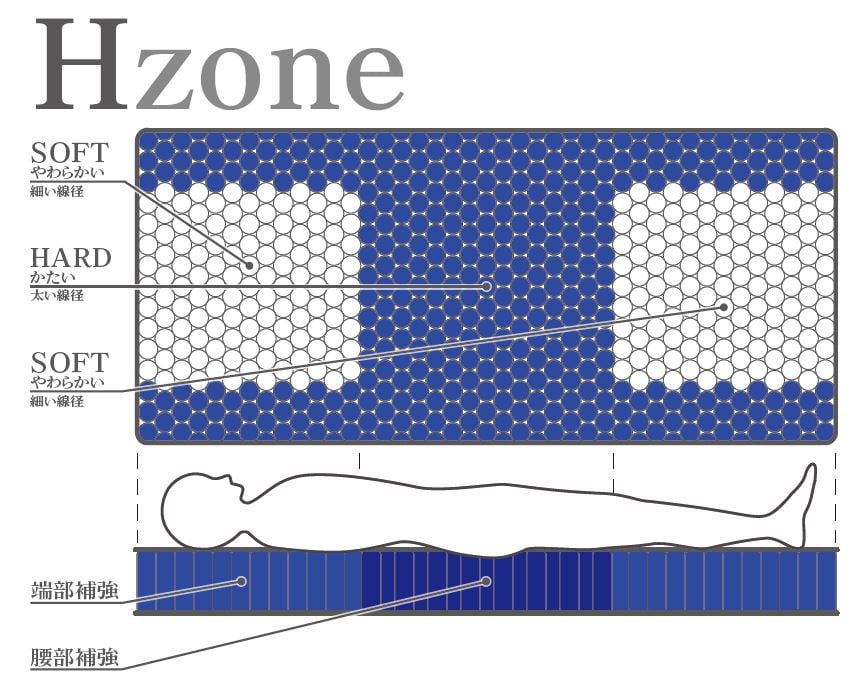 高い反発力とサポート力、心地良いフィット感を実現。両サイドと腰部に太い線径コイルを配列したHゾーン補強仕様により、ヘタレやすいマットレス端と体圧のかかる腰部を補強し理想的な寝姿勢をサポート。