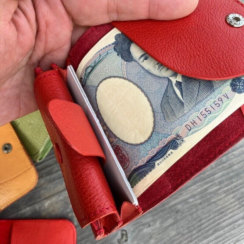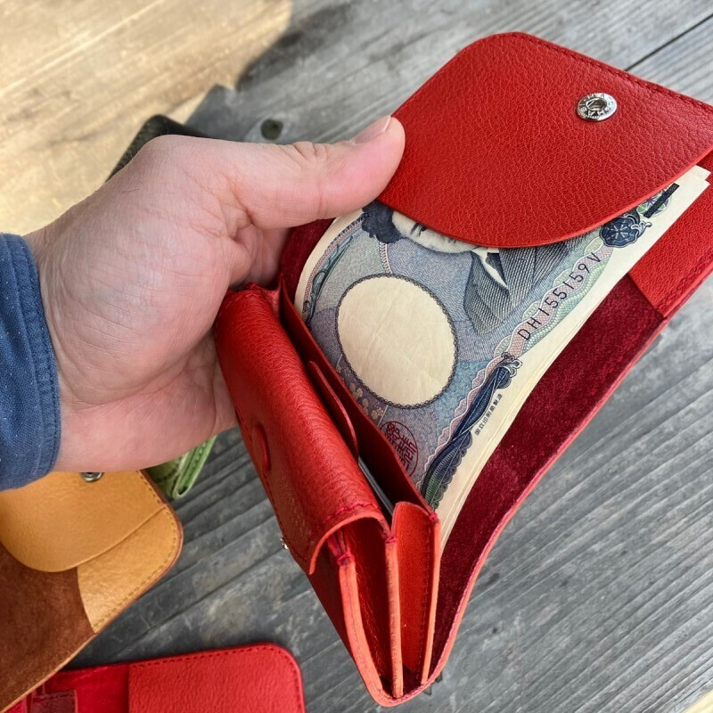 10枚程度のお札と、20枚程度の小銭、カードも5,6枚が余裕で入るミニウォレットです。カードは付属のフラップを引っ張ると飛び出しとても取り出しやすく設計されています。東広島産の鹿革を外装に使用しとても手触りの良いお財布に仕上がっています。普段使いやちょっとお出かけ時などに持ち歩くにはちょうどいい大きさのお財布です。コンパクトながらしっかり収納できるので店頭でも人気のお財布です。外装のジビエレザーのカラーを7色よりお選びください。牛革、ステッチ、ボタンのカラーはお任せとなります。