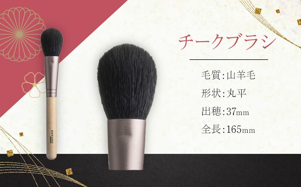 | 容量 | ・チーク(山羊毛) 形状:丸平 出穂:37mm 全長:165mm ・アイシャドゥ(灰リス) 形状:丸平 出穂:14mm 全長:144mm |