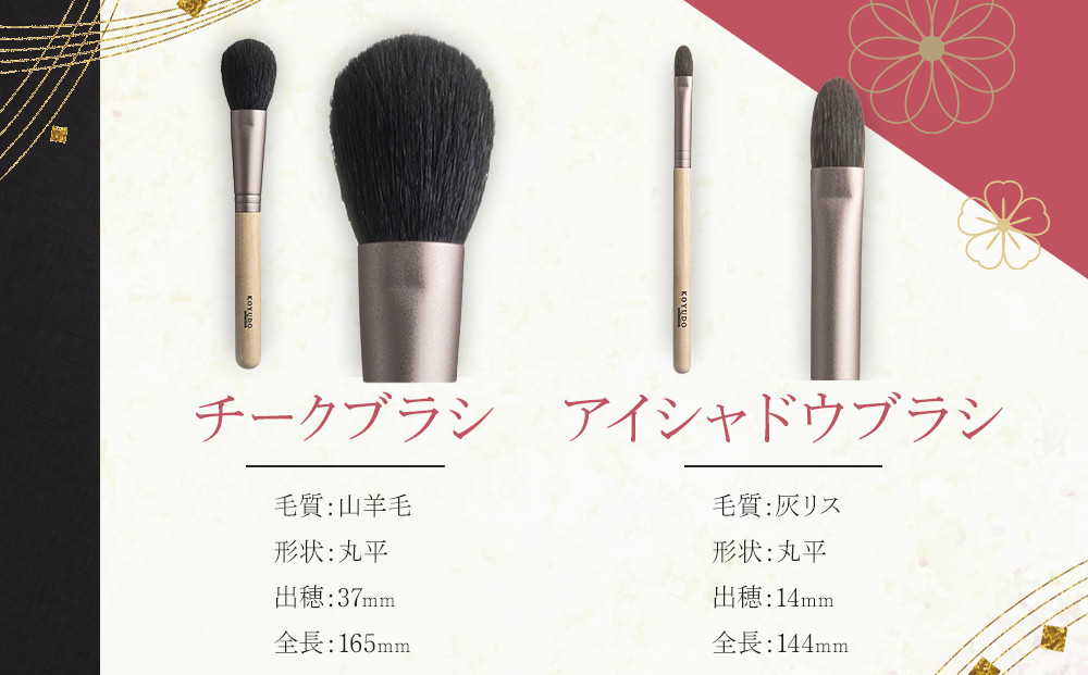 | 容量 | ・パウダー(山羊毛) 形状:丸平 出穂:45mm 全長:165mm ・チーク(山羊毛) 形状:丸平 出穂:37mm 全長:165mm ・アイシャドゥ(灰リス) 形状:丸平 出穂:14mm 全長:144mm |