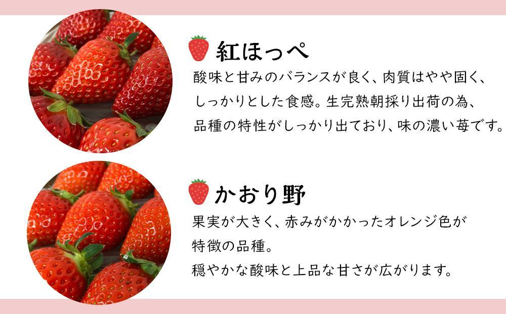 広島県産の苺「紅ほっぺ」「かおり野」「ベリーポップ すず」「スターナイト」「ほしうらら」のおまかせセット。