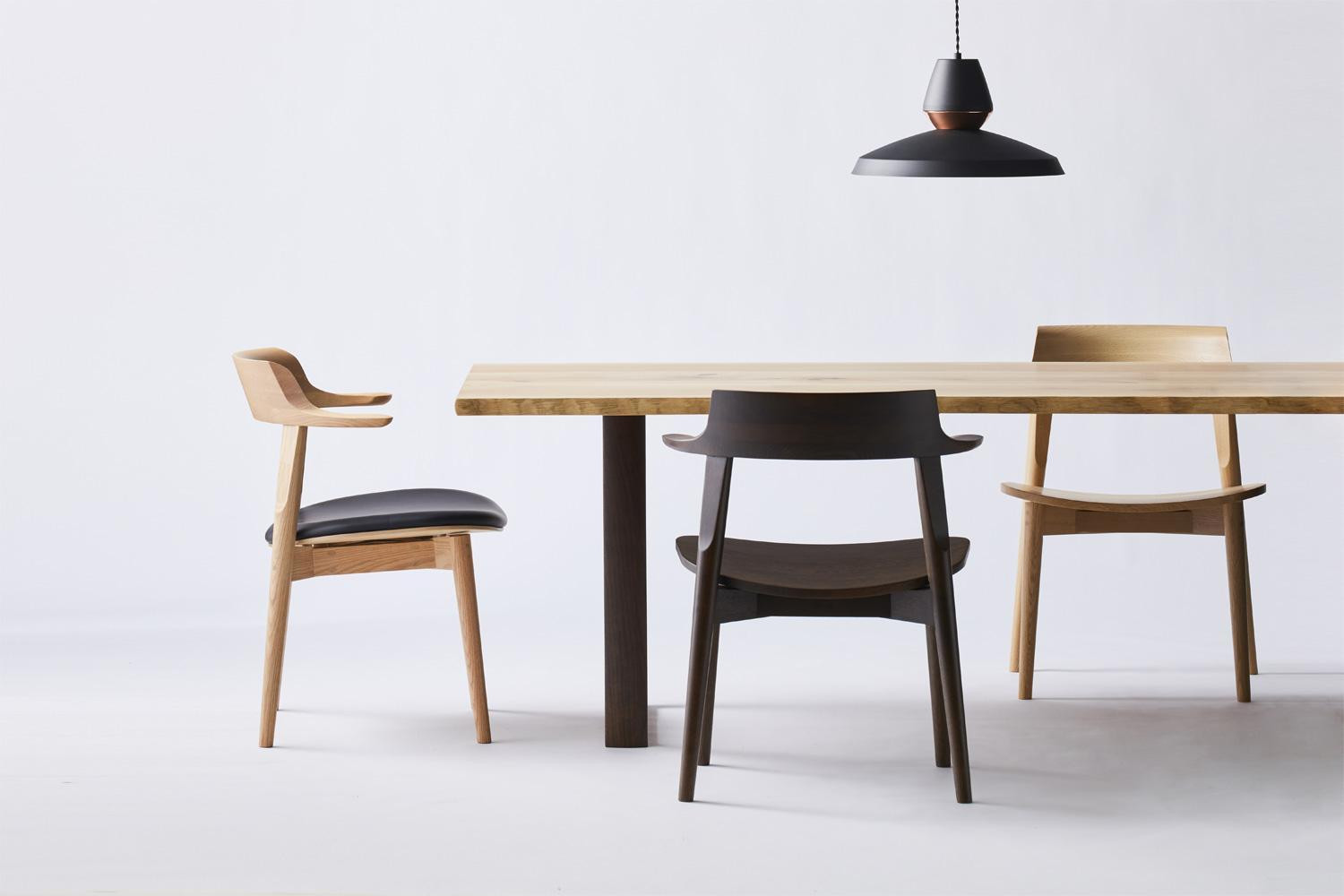 広島の象徴でもある厳島の大鳥居をイメージしたそのフォルムは、日本人に古くから馴染みのある形を再現しながらもモダンな印象を与えます。良質な無垢材をふんだんに使用し、デザイン性と坐り心地の良さを徹底的に追求した一脚は、浜本工芸らしい使い手を思った機能性と耐久性に加え、『見ていたい』『触れていたい』と感じてもらえるダイニングチェアに仕上がりました。