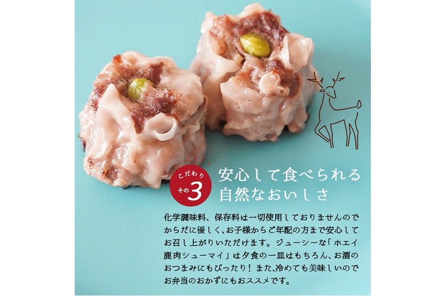 ジューシーな「ホエイ鹿肉シューマイ」は夕食の一皿はもちろん、お酒のおつまみにもぴったり!また、冷めても美味しいので、お弁当のおかずにもおススメです。
