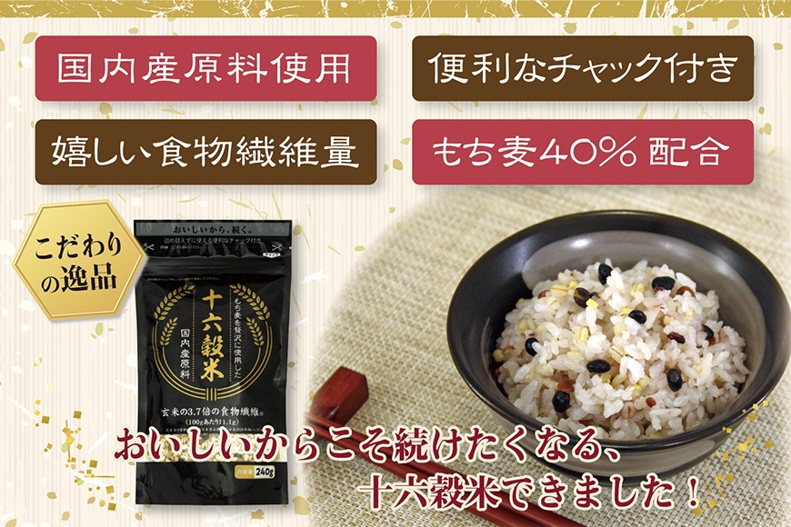 もち麦を贅沢に使用した十六穀米 国内産原料 240gは、広島県安芸高田産のもち麦を40%使用し、食感も良く、クセなく食べられる仕上がりで変色も少ないです。もち麦以外の雑穀類も国内産原料を100%使用し、美味しくお召し上がりいただけます。『おいしいからこそ、続けたくなる』十六穀米をぜひお試しください。