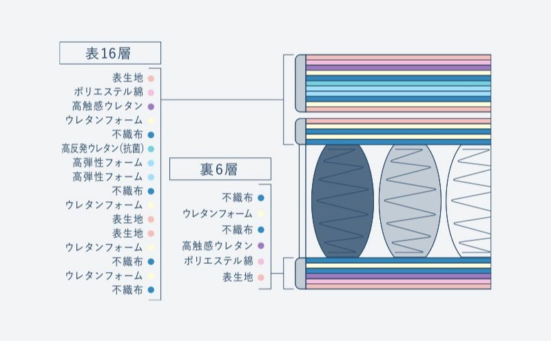 3種類の8インチの樽型ポケットコイルを11ゾーンに配列。