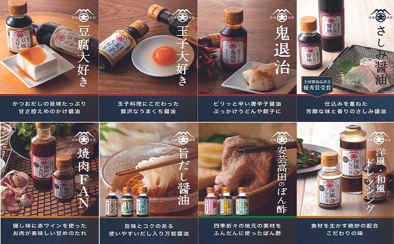 艶やかな黒に旨みを詰め込んだ「さしみ醤油」と、安芸高田市の土師さくら亭料理長とコラボした商品「焼肉FAN」、 ごまの風味と酸味がきいた爽やかな味わいの「和風ドレッシング」、そして、伝統の本醸造醤油を基に安芸高田産のゆずを中心に生搾りした果汁を贅沢に使用した「生ゆずぽん酢」、玉ねぎをあめ色になるまで炒めてたっぷりと入れ込んだ「洋風ドレッシング」、瀬戸田レモンを一つ一つ丁寧に手作業で加工、全国初の「生れもんぽん酢」、安芸高田産とまと100%使用、自社でじっくりと煮込んだ「とまとぽん酢」など