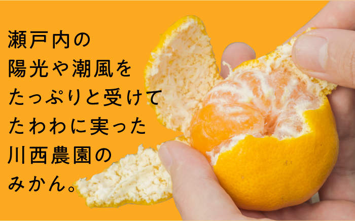 瀬戸内の陽光や潮風をたっぷりと受けてたわわに実った川西農園みかん畑のみかん。目に鮮やかな色合いとツヤ、フレッシュな香り、ジューシーな味わい、程よい歯ごたえが人気で毎年全国各地のファンに直送されています。