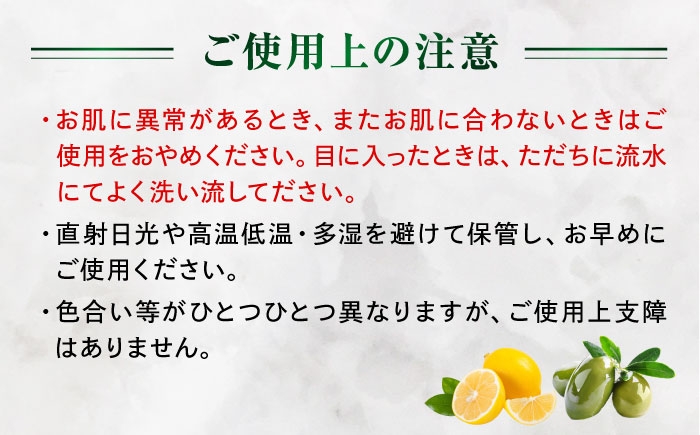【全成分】石ケン素地、カリ石ケン素地、レモン果皮油、オリーブ果実油、オリーブ果実、レモングラス油、グリセリン、ラウリン酸、水、トコフェロール、エチドロン酸4Na