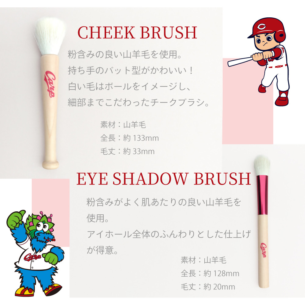広島東洋カープへの熱い思いを込め、野球の命でもあるバットを模したチークブラシをはじめ、メイクブラシの中でも需要の高いアイシャドウブラシ、アイブロウブラシの3本に、ボールをイメージしたブラシケースをセットにしました。