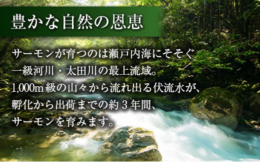芸北サーモンが育つのは、瀬戸内海にそそぐ一級河川・太田川の最上流域。1,000m級の山々から流れ出る伏流水が、孵化から出荷までの約3年間、サーモンを育みます。
