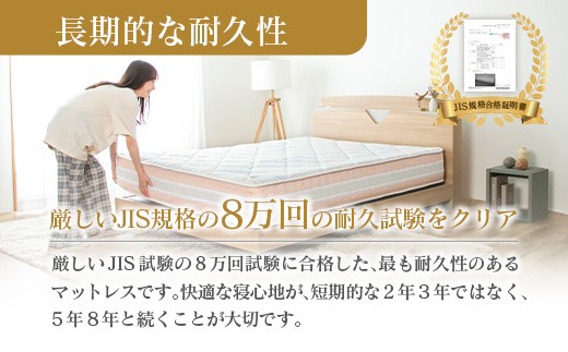 | 容量 | 咲夜レアルポケットコイルマットレス(ワイドダブル)[1点] 【仕様】 ■サイズ:ワイドダブル 幅150cm × 長さ195cm × 厚み26cm 重量42~52kg ■コイル数:フィット・ジャスト 744本 / キープ 812本 ■線径:フィット 1.9mm(エッジハード2.2mm) / ジャスト 2.1mm(エッジハード2.2mm) / キープ 2.2mm ■表生地:ポリエステル100% ■側生地:ポリエステル100% ■中材:ウレタン、不織布、防ダニ抗菌綿 ■両面仕様 |