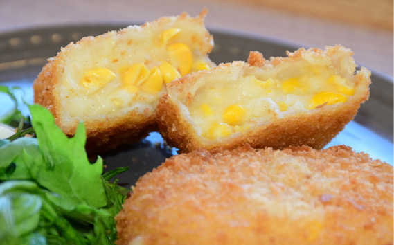世羅高原農場で採れた糖度18度の甘~い「ミエルコーン」を使用した、農場でも大人気のクリームコロッケです!